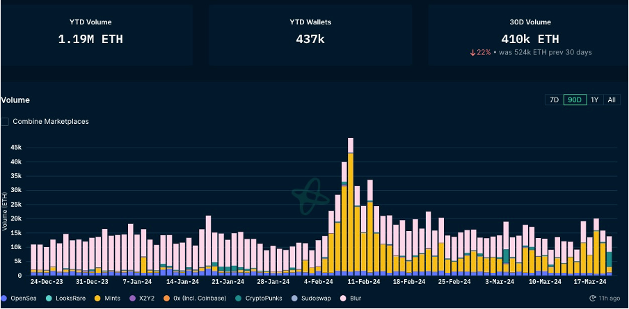 本周NFT市场蓝筹项目地板价有涨有跌,但波动幅度不大。.BAYC下跌4%,MAYC上涨2%,CryptoPunks上涨7%,Azuki上涨近3%,Pandora下跌2%,Milady上涨6%。本周NF市场大盘继续下跌,并且已经跌到过去一年**点。本周NFT市场总交易量有小幅回升,但**购买NFT买家和复购买家数量依旧没有**起色。伴随牛市的到来,NFT市场的低迷还在持续。