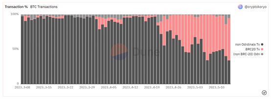 3月9日,由创始人domo非正式提出BRC-20 协议引发了FOMO效应,根据ordspace.org显示,截止5月14日,已经有超过18,279个BRC-20**项目,总市值超过5亿美元。目前,BTC网络上BRC-20协议相关交易量已经超过了非 Ordinals 协议交易量。5月7日和5月14日,BRC-20 协议交易量一度占比超 65%,市场情绪似乎仍在继续。