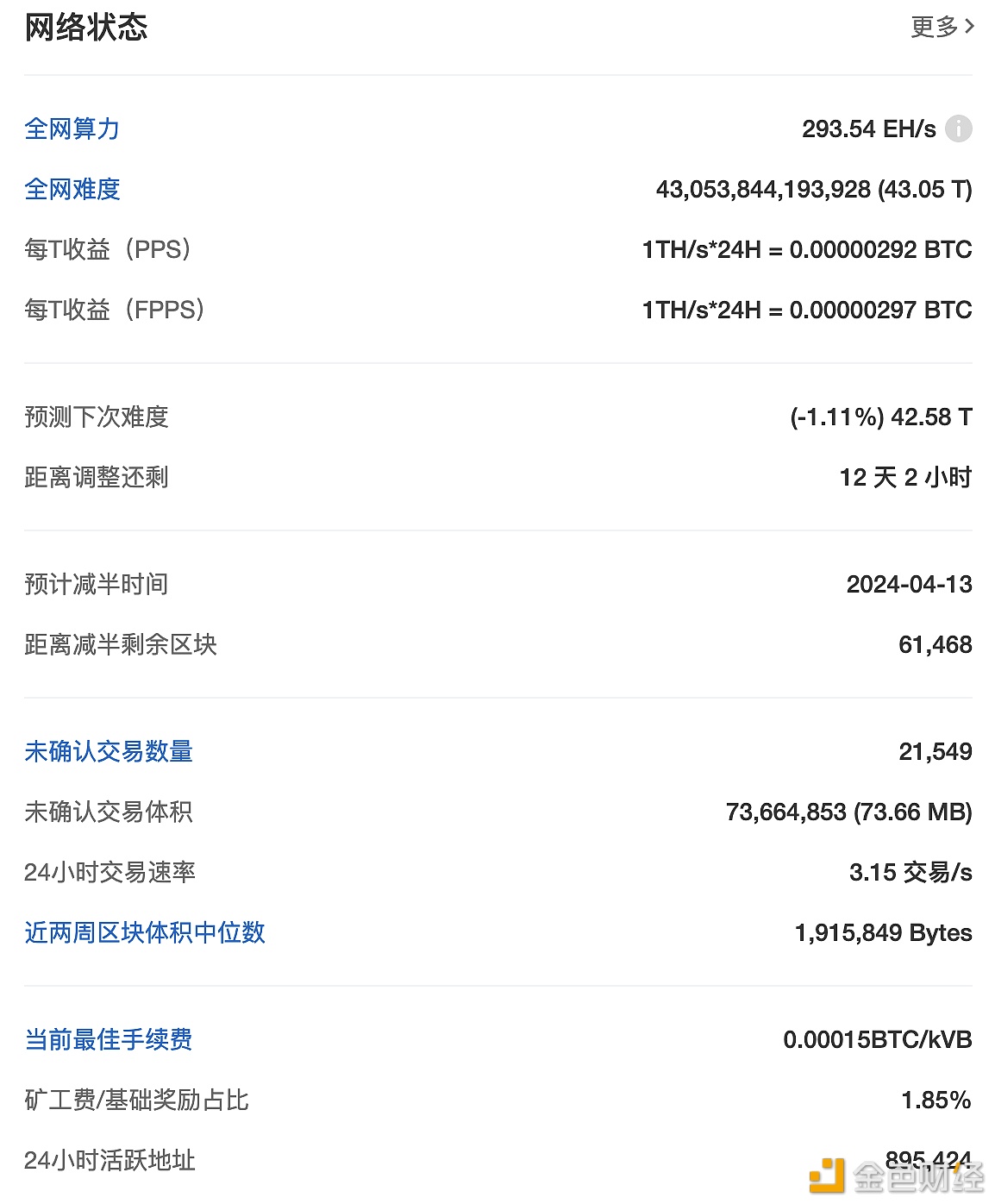 据BTC.com数据显示,目前比特币**未确认交易数量为21549笔,**算力为293.54 EH/s,24小时交易速率为3.15交易/s,目前**难度为43.05 T,预测下次难度下调1.11%至42.58 T,距离调整还剩12天2小时。