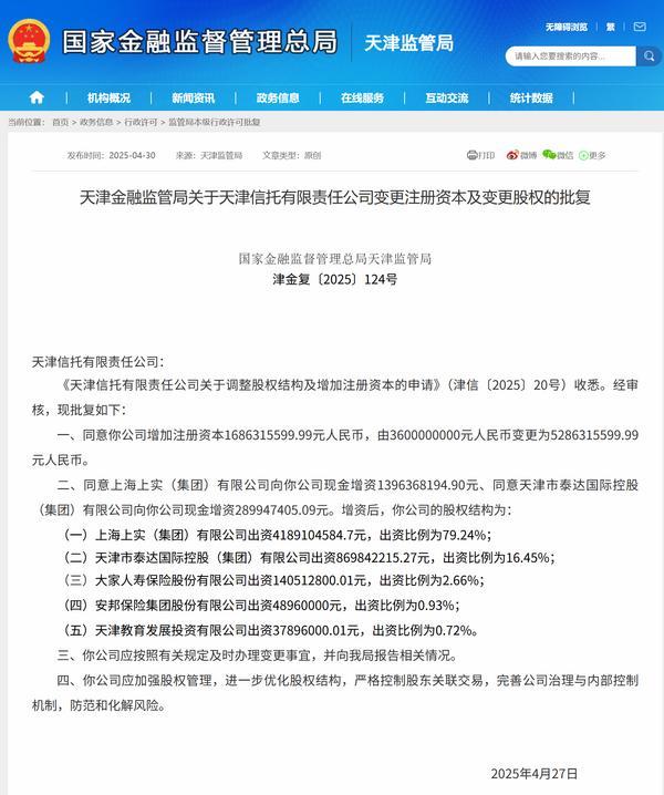 增资后,天津信托的股权结构为:(一上海上实(集团有限公司出资41.89亿元(4,189,104,584.70元,出资比例为79.24%;(二天津市泰达**控股(集团有限公司出资8.70亿元(869,842,215.27元,出资比例为16.45%;(三大家人寿保险股份有限公司出资1.41亿元(140,512,800.01元,出资比例为2.66%;(四安邦保险集团股份有限公司出资0.49亿元(48,960,000元,出资比例为0.93%;(五天津教育发展投资有限公司出资0.38亿元(37,896,000.01元,出资比例为0.72%。