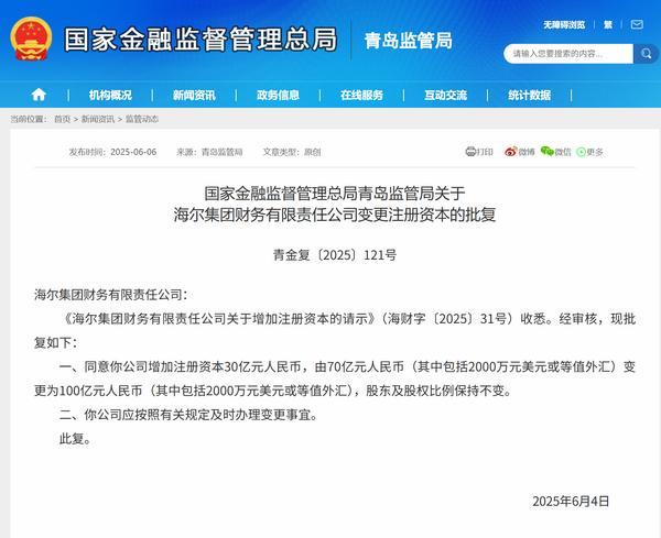 财经6月9日讯 日前,**金融监督管理总局青岛监管局公布相关批复,同意海尔集团财务有限责任公司(简称“海尔财务公司”增加注册资本30亿元人民币,由70亿元人民币(其中包括2000万元美元或等值外汇变更为100亿元人民币(其中包括2000万美元或等值外汇,股东及股权比例保持不变。以下是相关批复正文: