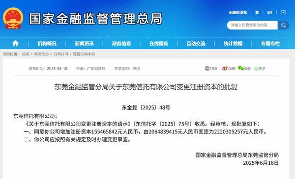 财经6月18日讯 今日,东莞金融监管分局公布相关批复,同意东莞信托有限公司(简称“东莞信托”增加注册资本1.55亿元(155,465,842元,由20.65亿元(2,064,839,415元变更为22.20亿元(2,220,305,257元。以下是相关批复正文:
