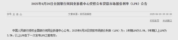 财经6月20日讯 今日,**人民银行授权**银行间同业拆借**公布,2025年6月20日**市场报价利率(LPR为:1年期LPR为3.0%,5年期以上LPR为3.5%,均较前值持平。以上LPR在下一次发布LPR之前有效。