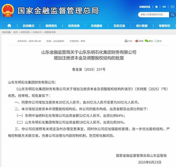 东明石化财务公司增资获批 注册资本变更为50亿元