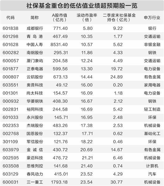 从机构持仓角度来看,据数据宝统计,业绩超预期的个股中,二季度末获得社保基金持仓的有41股,其中7股获持仓市值超10亿元,分别是三一重工、云铝股份、正泰电器、金诚信、鹏鼎控股、西部超导、赤峰黄金。