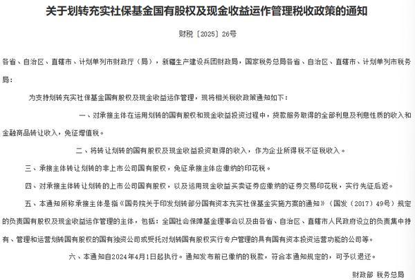此次发布的《关于划转充实社保基金国有股权及现金收益运作管理税收政策的通知》,为社保基金的投资运作送上了一份“大礼包”,通过四项精准的税收减免,**覆盖了投资过程中的主要成本环节:免征增值税,对承接主体在运用划转资产投资过程中取得的**服务利息及金融商品转让收入予以免征;企业所得税不征税,将转让划转资产取得的收入作为企业所得税的不征税收入;免征印花税,承接主体转让划转的非上市公司国有股权免征印花税;以及证券交易印花税先征后返,对转让划转的上市公司国有股权及运用现金收益买卖证券的印花税实行先征后返。