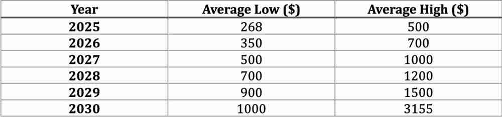 2030年: 根据自信的分析师的说法,到2030年,门罗币可能达到1,200美元,最乐观的估计预测,如果机构和零售市场广泛采用隐私币,价格可能高达3,100美元。