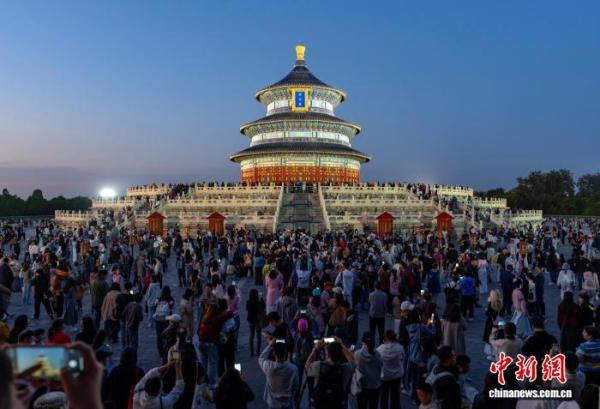 10月6日晚,北京天坛公园祈年殿亮灯,吸引众多游客前来观赏拍照。 中新社记者 张炜 摄