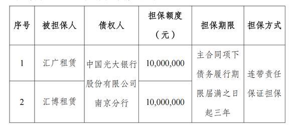 江苏金租:将为汇广租赁、汇博租赁分别提供1000万元担保