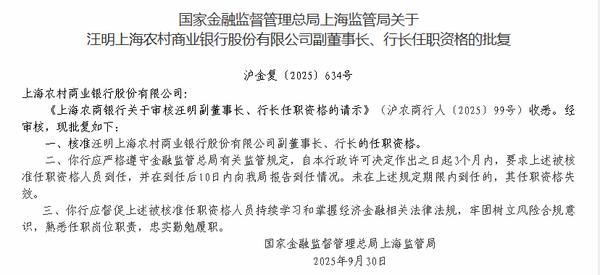 上海农商银行行长汪明任职资格获批 作者:LR •更新时间:2025-10-09 13:15:53•阅读 0 财经10月9日讯 近日,**金融监督管理总局上海监管局发布批复显示,核准汪明上海农村商业银行股份有限公司副董事长、行长的任职**。 张紫祎