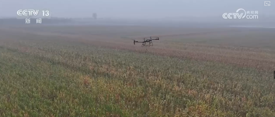 在菏泽市郓城县,由于不少地块出现积水,植保无人机同样成为当地秋粮抢收的主力。