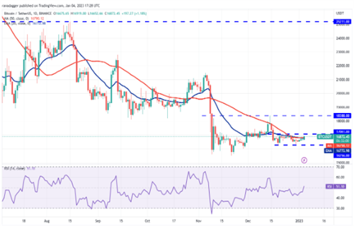 比特币$16,7851月4日攀升至移动平均线上方,表明买入处于较低水平。下一个值得关注的上行水平是17,061美元,空头可能会在此形成强大的阻力位。