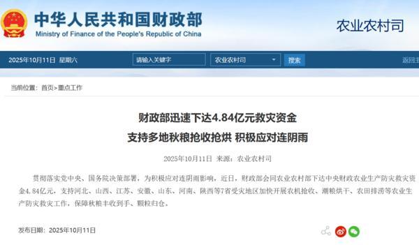 财政部迅速下达4.84亿元救灾资金 支持多地秋粮抢收抢烘