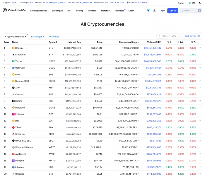 Top20 加密货币价值(截图 via CoinMarketCap)