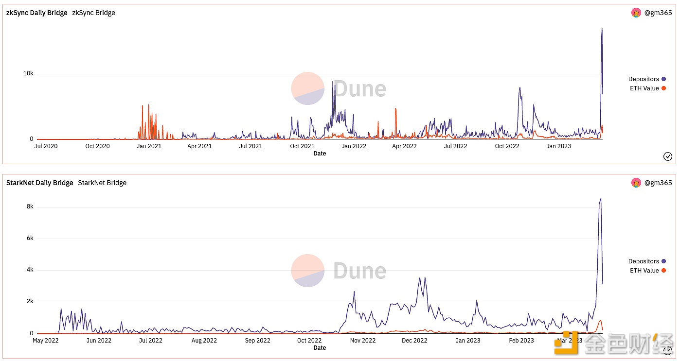 3月20日消息,据 Dune 数据显示,昨日共有 17,012 笔交易将 2237.6 枚 ETH 桥接至 zkSync,共有 8572 笔交易将 858.5 枚 ETH 桥接至 StarkNet,跨链桥接 ETH 至 zkSync 与 StarkNet 网络的笔数均创单日历史新高。
