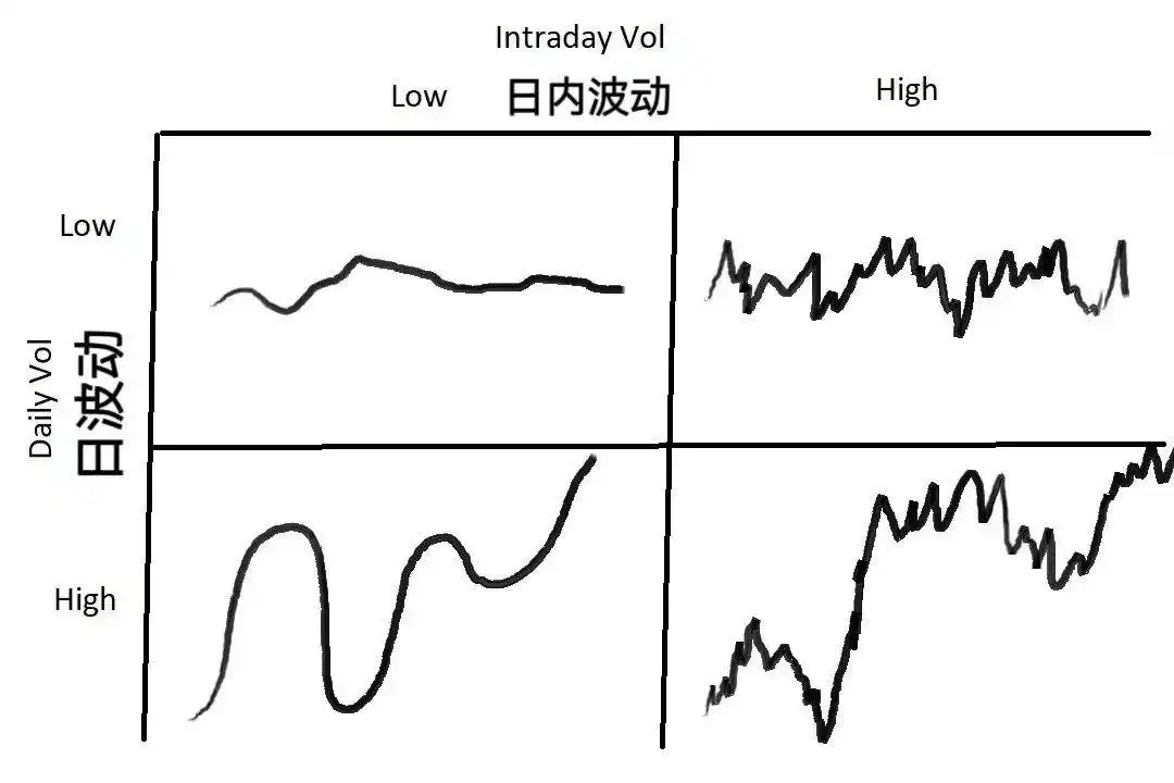 波动性简单来说,就是价格离其均值的偏离程度,不同的时间窗口下价格的波动性是不同的。一个品种可能在 1 分钟级别的 k 线图上上蹿下跳,而在日线图上的走势波澜不惊。成交量则告诉我们了流动性,流动性会影响挂单的 spread 和成交**。