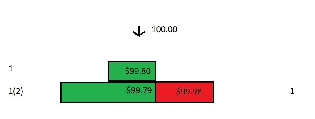 于是你调整了一下订单薄,在买一和买二分别挂上了 99.80 和 99.79 的单子,并在卖一挂上了 99.98 的单子: