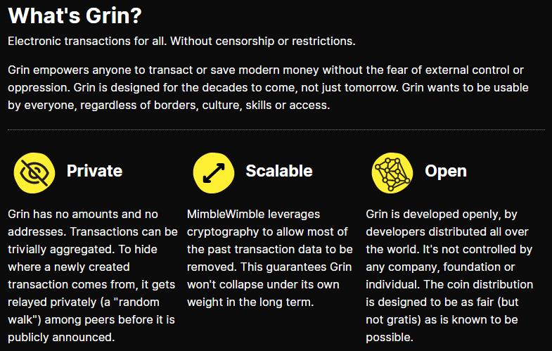 根据官网的描述,Grin是为未来几十年设计的、没有第三方限制的、可供全民使用的现代电子货币。项目主要特点如下,