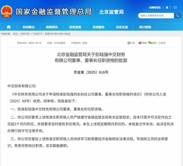 财经10月13日讯 日前,北京金融监管局公布相关批复,核准彭陆强中交财务有限公司董事、董事长的任职**。以下是相关批复正文: