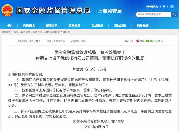 财经10月13日讯 今日,**金融监督管理总局上海监管局公布相关批复,核准崔炳文上海**信托有限公司(简称“上海信托”董事、董事长的任职**。以下是相关批复正文: