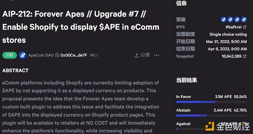 ApeCoin社区发起AIP-212提案,拟推动Spotify等电子商务平台支持APE**显示。如果该提案获得通过,ApeCoin社区将会构建一个定制插件以将APE集成到 Shopify 产品页面上显示的货币中,该插件将免费提供给零售商,并将增强其平台的功能。据悉,该提案目前已经启动投票并将于4月6日上午结束,目前支持率达到55.54%。