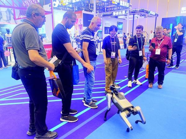 外国客商在机器人展区逗机器狗。 记者 周亮 摄