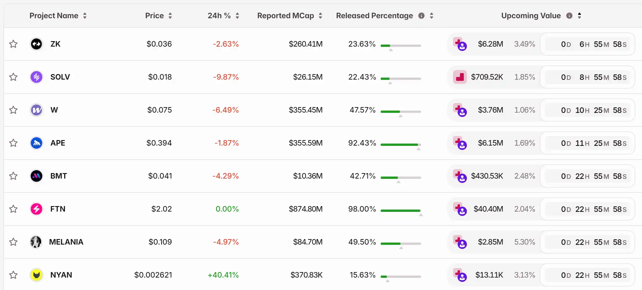 每日市场整体资金热度(根据资金费率反映)与**解锁