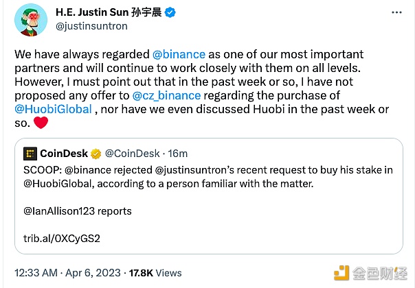 Justin Sun 在社交媒体上针对此前 Coindesk 报道的Binance 已拒绝收购其 Huobi 股份一事发布回应表示,Binance 一直是 Huobi 的合作伙伴,未来也将继续合作,但过去一周内其从未向 CZ 提出过收购 Huobi 股份的邀约或提议。