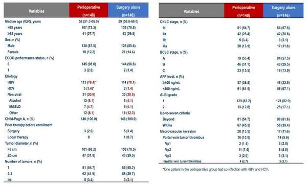 自2021年3月25日至2024年1月29日,共随机294例受试者,围手术组148例,单纯手术组146例。围手术组和单纯手术组的基线人口统计学和临床特征均平衡,两组的中位年龄分别为58和59岁;大部分患者为男性(88% vs 86%,ECOG 0分(98% vs 99%,HBV感染(76% vs 78%,肿瘤**直径>5cm(68% vs 71%,单病灶(55% vs 58%。两组不同CNCL分期、巴塞罗那分期(BCLC的患者人数相当,CNCL Ib期为55% vs 58%,CNCL IIa期28% vs 29%,CNCL IIb期3% vs 2%,CNCL IIIa期为14% vs 12%;BCLC A期为53% vs 58%,BCLC B期为31% vs 29%,BCLC C期为16% vs 13%。