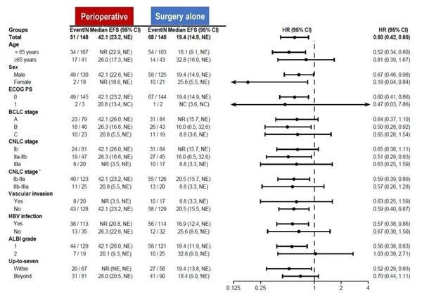 围手术组的EFS获益在大多数预设的亚组中基本一致,包括伴中危复发风险和高危复发风险的患者。