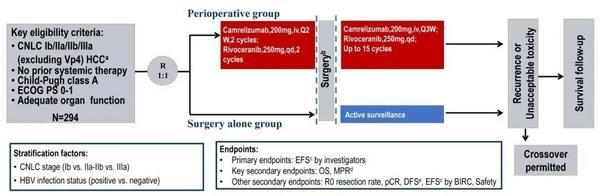 CARES-009研究是一项**多**、随机、开放、平行对照的3期临床研究(ClinicalTrials.gov,NCT04521153,****分期(CNLCIb-IIIa期可切除HCC患者按照1:1随机分配到围手术组或单纯手术组,随机分层因素为CNLC分期(Ib vs IIa/IIb vs IIIa和乙肝病毒(HBV感染状态(HBV阳性 vs HBV阴性。围手术组接受2个周期的新辅助卡瑞利珠单抗(200mg,iv,q2w联合阿帕替尼(250mg,qd**,新辅助末次**1-2周后手术,手术后4-8周开始术后辅助卡瑞利珠单抗(200mg,iv,q3w联合阿帕替尼(250mg,qd**,术前术后**一年;单纯手术组随机后直接手术,术后观察;两组均允许患者术后做一次预防性经动脉化疗栓塞(TACE**。