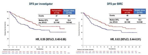 与单纯手术组相比,研究者和BIRC评估的围术期**组DFS均有延长。