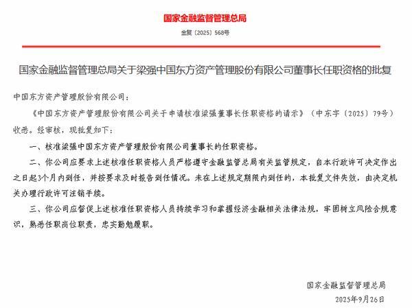 中国东方资产董事长梁强任职资格获批 作者:LR •更新时间:2025-10-22 09:16:48•阅读 0 财经10月22日讯 近日,**金融监督管理总局公布批复显示,核准梁强**东方资产管理股份有限公司董事长的任职**。 王擎宇