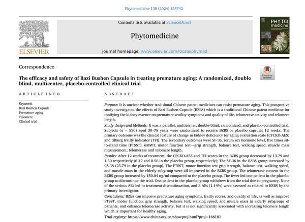 在临床层面,围绕八子**胶囊开展的530例随机、双盲、安慰剂对照、多**人体循证研究,开创中药抗衰老领域大型临床试验先河。该研究显示,服用八子**胶囊12周后,受试者衰老症状显著改善,躯体及心理状态提升,运动耐力和生活质量提高。尤为突出的是,受试者端粒酶活性(**公认的抗衰老生物标志物较对照组提高76.7%。