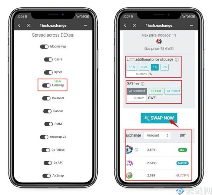 4.选择**和数量后,向下拉动界面可以看到下图(左)列出的这些DEX平台,用户可以关闭一些他们不想与之互动的平台DEX,只需点击按钮,如果选中DEX如果关闭,交易将不会通过这些平台。图中100%意味着所有交易都是通过的Uniswap进行。继续下拉可在下图(右)设上限,GAS费用也可以在底部看到DEX平台数据信息,1inch会自动选取**兑换路径。
