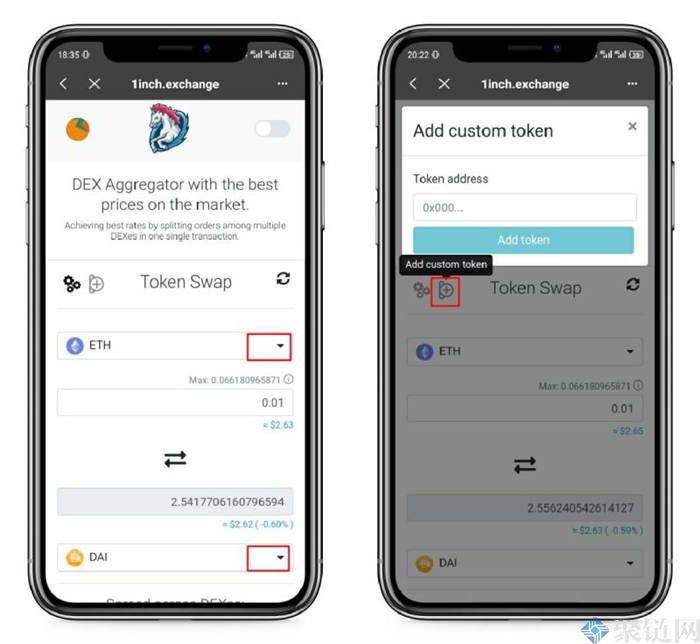 1.用手机给网友详细讲解,可以下载TokenPocket创建以太坊钱包,在钱包中找到界面DeFi专栏打开https://app.1inch.io/或在顶部搜索栏输入1inch.exchange打开。