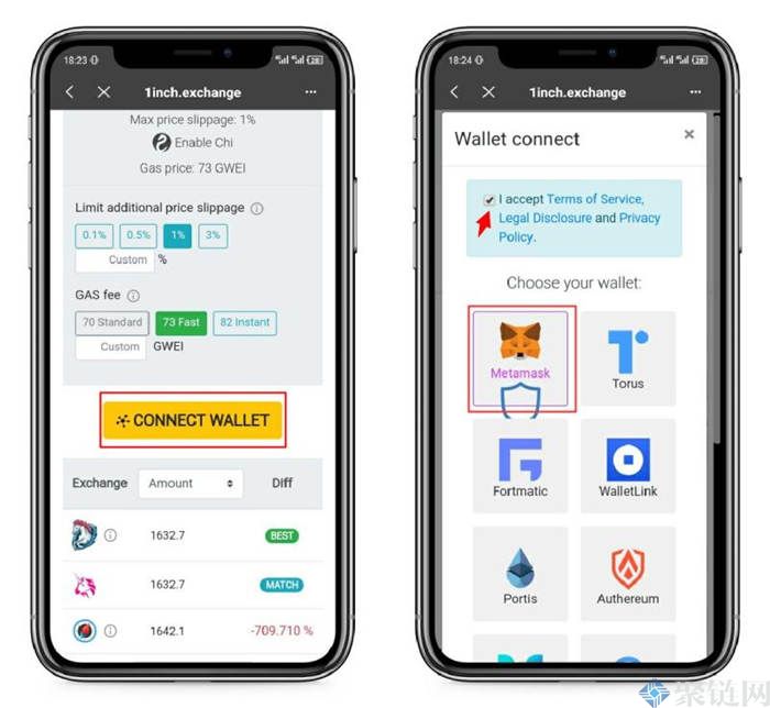 2、打开1inch.exchange后向下拉,点击链接钱包,勾选“我已阅读”选择**个“小狐狸”虽然这个界面不支持钱包TokenPocket,选择**个也可以拉起钱包授权。