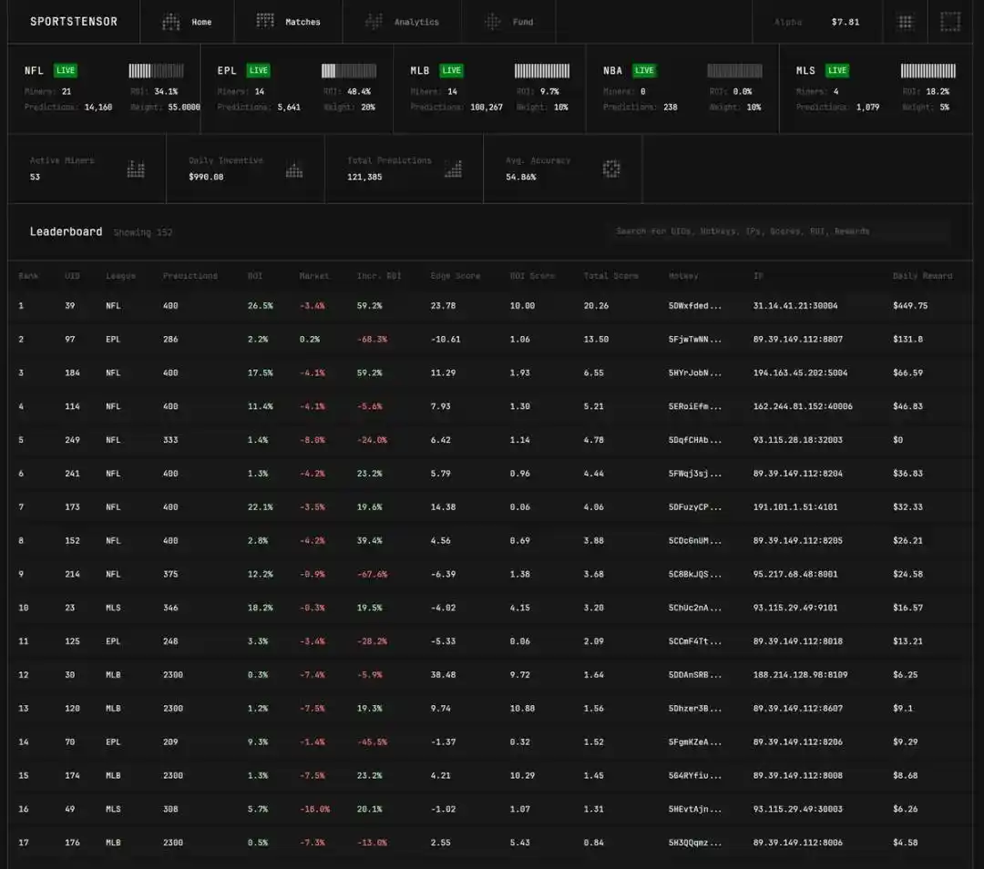 这是一个专注于「击败市场**」的子网,旨在挖掘全球体育**市场中的「优势机会」。这是一场持续性竞赛:机器学习工程师需部署模型,预测美国职业棒球大联盟(MLB)、美国职业足球大联盟(MLS)、英格兰足球超级联赛(EPL)、美国职业篮球联赛(NBA)等主流体育联赛的赛事结果,能实现盈利的「**模型」将获得 SN41 Sportstensor 阿尔法**奖励。