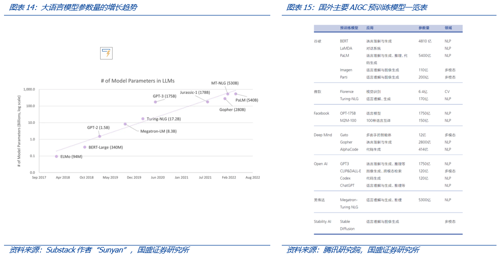 2017年以来,AIGC模型的参数量逐年增加,从,2021年以来,这一趋势呈现出明显加快的状态,从ELMo的9400万个参数一路飙升,至2020年年中,GPT-3**行业走入千亿参数时代,参数达1750亿个,截至2021年年中,英伟达大语言模型MT-NLG更是超过了5300亿。