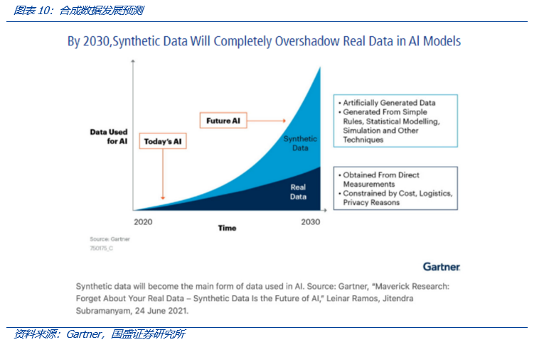 到2024年用于训练AI的数据中有60%将是合成数据; 到2025年,AIGC生成的数据将占所有合成数据的10%,而目前这一比例还不到1%。 到2030年AI模型使用的绝大部分数据将是人工智能合成的。这一方面体现出市场对合成数据的看好,另外一方面,我们认为,这反应出市场当前互联网公开数据可能存在被AI模型“耗尽”的担忧。