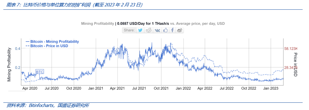 需要注意到,比特币挖矿出现内部过度竞争存在若干前提,实际情况中,内部过度竞争并非**会出现。根据Bitinfocharts统计,截至2023年2月23日的三年以来,比特币**算力呈现平稳上升趋势,而与此同时,单位算力的挖矿利润呈现平稳下降趋势,这呈现出**的“内部过度竞争”特征。一个重要原因是,比特币价格在此期间呈“横盘震荡”状态。