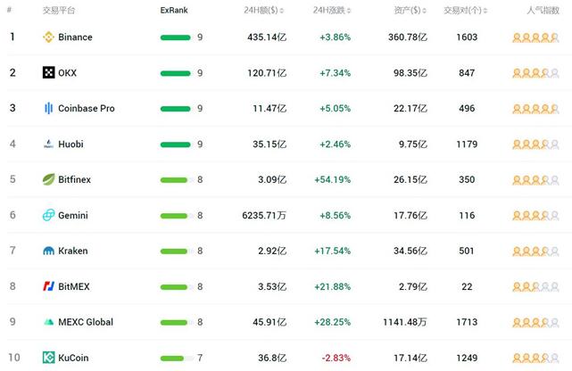 全球虚拟币交易平台哪个好,是一个综合实力的榜单,主要参照的标准时交易量多少,交易对丰富程度,资金实力,热度等等几个维度,总之选大平台就对了,风险肯定是要小很多的,希望给给大家炒币创造一个安全、健康的环境。