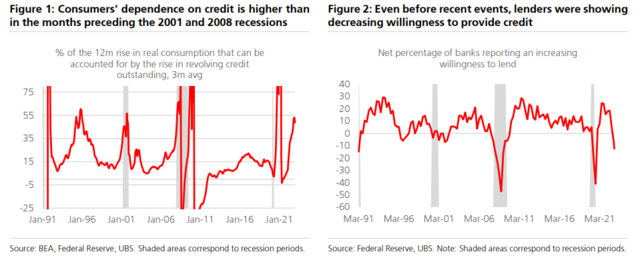 瑞银认为,2022年实际消费增长的40%以上可以归因于循环信贷余额的增加,其中主要是信用卡余额。整体信贷增长了15%,但这一速度是不可持续的。在过去两周的危机发生后,信贷紧缩的加剧可能对经济增长和政策利率的未来路径构成下行风险。
