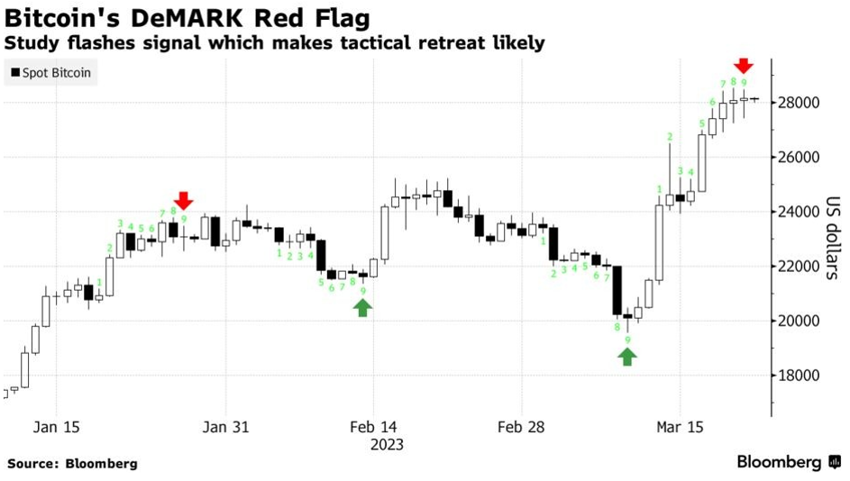 DeMARK 序列指标是一种预测市场趋势何时结束的价格动量分析方法,上图中的红色箭头区域可以看出,比特币价格可能会有临时回调的可能,Fairlead Strategies LLC创始人Katie Stockton在一份报告中写道,DeMARK指标显示比特币可能出现中性的短期回调,但其他分析模式则预示比特币会有“长期突破”。