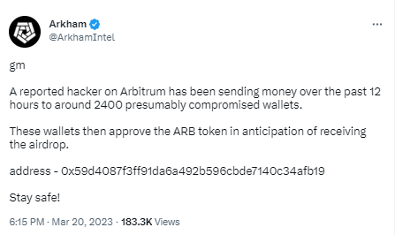 3月21日消息,加密数据公司Arkham在推特上表示:“被Nansen标记为 Arbitrum Airdrop Exploiter的黑客地址在过去12小时内向大约2400个私钥泄露的地址发送以太坊作为gas费,并提前授权ARB合约,准备抢先领取ARB空投。”