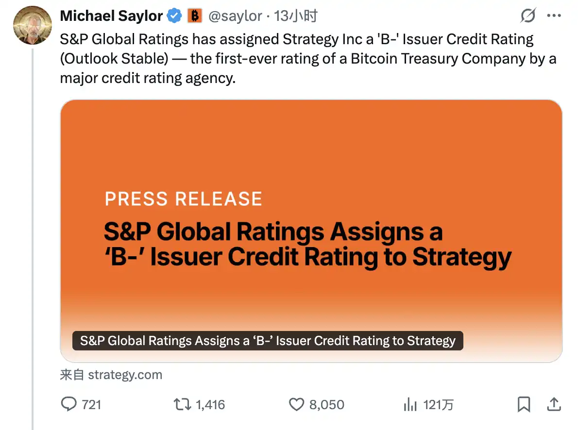 Strategy 创始人 Michael Saylor 在个人 X 账户上大大方方地转发了相关动态,并庆祝「Strategy 成为了**获主流信用评级机构定级的数字资产财库公司」。