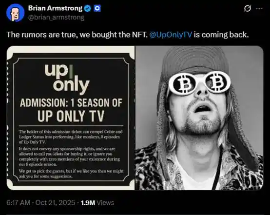 10 月 21 日,Coinbase 花费 2500 万美元从 Cobie 手中购入 UpOnly NFT。随后 Coinbase CEO Brian Armstrong 发文证实该消息的真实性。Brian 表示,「持有此入场券(NFT)的人,可以强迫 Cobie 和 Ledger Status 像猴子一样表演,录制 8 集《Up Only TV》节目此门票不赋予**赞助权利,而且我们有权称你为「买这玩意儿的傻瓜」,或**无视你的存在——在整个 8 集节目中不提你一字。嘉宾由我们自行决定,但如果我们觉得你挺有意思,或许会听听你的建议。」