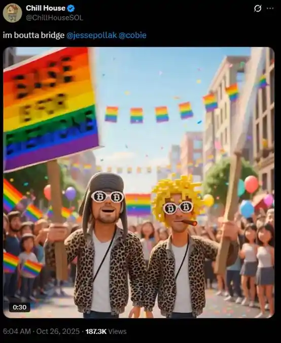 10 月 27 日,Chillhouse 日常抽风,「**你的 Toly,**你的 Mert(Helius CEO),**你的 Solana 基金会」。