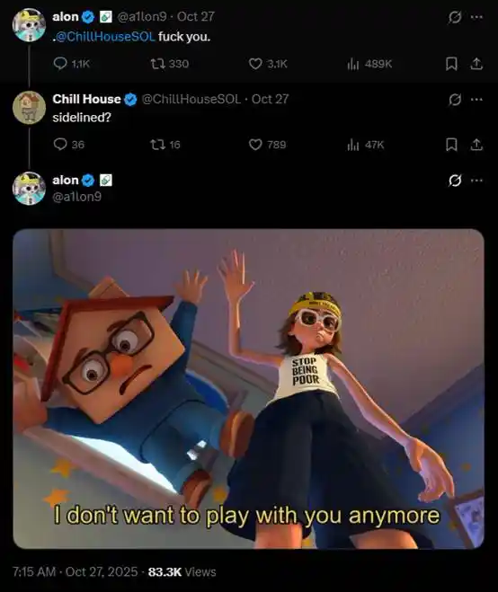 然后 alon 登场,上来就开大,「**你的 Chillhouse」。Chillhouse 回复,「踏空了?」,alon 则以一张「我再也不想跟你玩耍」了的图片回应。