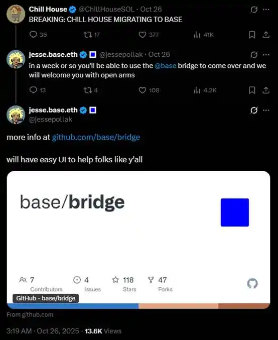 那么 Jesse 真实的意图是什么?如果不靠猜测,只凭公开的推文来看的话,Jesse 想的是吸引 Solana 上优质的 meme 社区以及 dev。看下面这条推文就可以看到,Chillhouse 在抽风,但 Jesse 在评论区却很认真地把 Base 跨链桥的 Git** 页面都给发上来了: